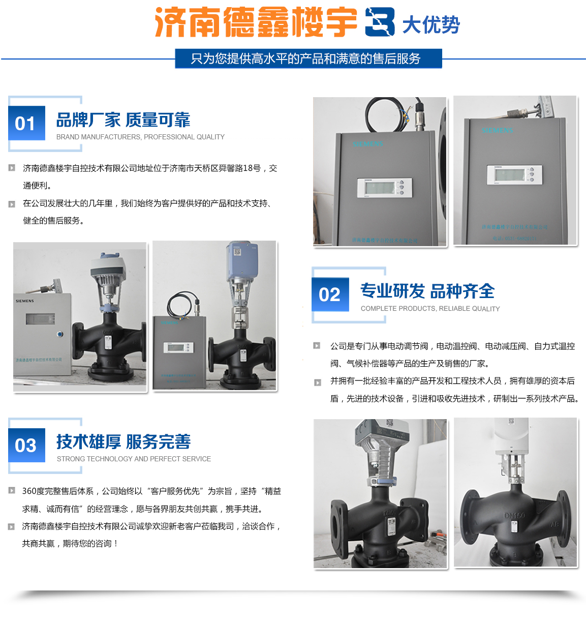 濟(jì)南德鑫樓宇自控技術(shù)有限公司是專(zhuān)門(mén)從事電動(dòng)調(diào)節(jié)閥,電動(dòng)溫控閥、電動(dòng)減壓閥、自力式溫控閥、氣候補(bǔ)償器等產(chǎn)品的生產(chǎn)及銷(xiāo)售。濟(jì)南德鑫樓宇自控技術(shù)有限公司擁有一批經(jīng)驗(yàn)豐富的產(chǎn)品開(kāi)發(fā)和工程技術(shù)人員,擁有先進(jìn)的技術(shù)設(shè)備,引進(jìn)和吸收先進(jìn)技術(shù),研制出一系列技術(shù)產(chǎn)品。